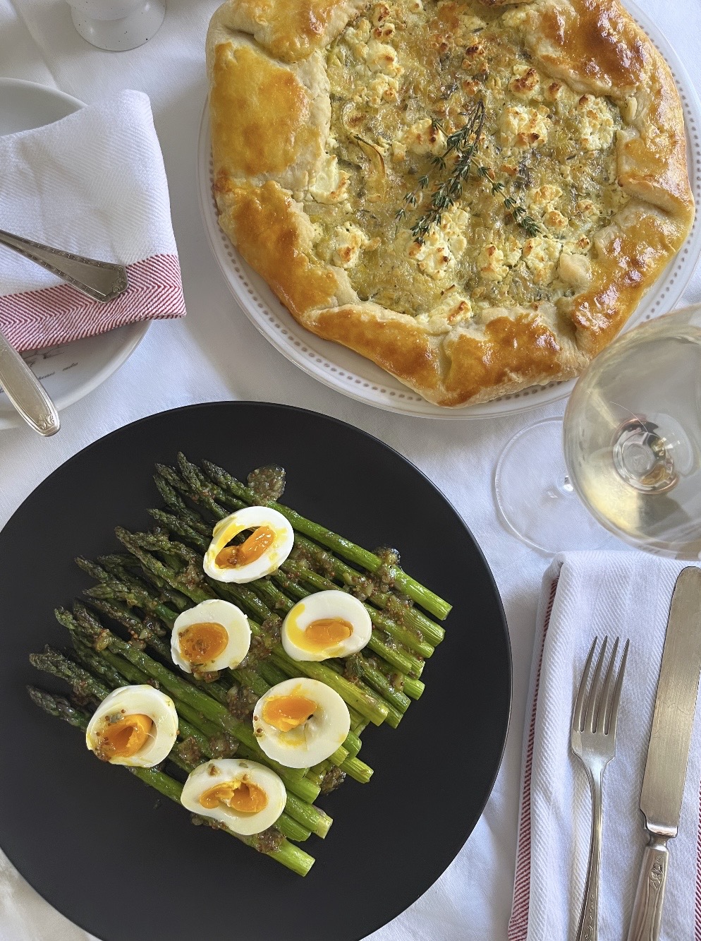 We’ll pair it with a crisp shaved radish and parsley salad in a lively lemon vinaigrette, and tender asparagus topped with classic gribiche, a French-style egg and herb sauce that adds richness and brightness to spring vegetables.